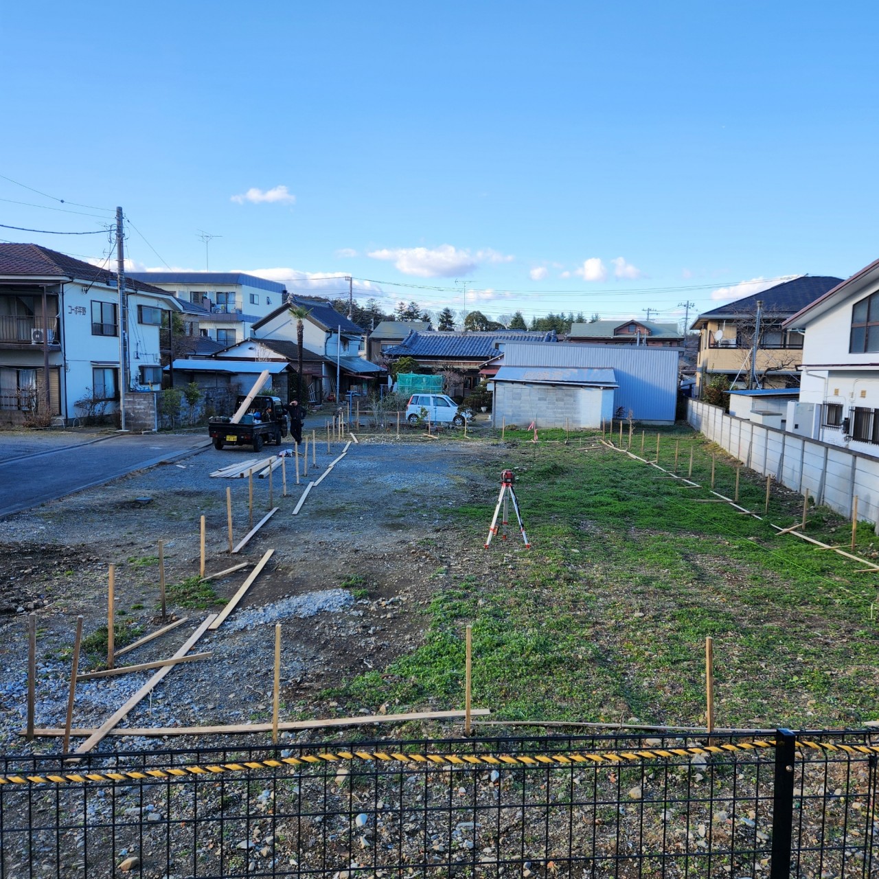 建物の配置や地盤面を決めるやり方工事から始まり、