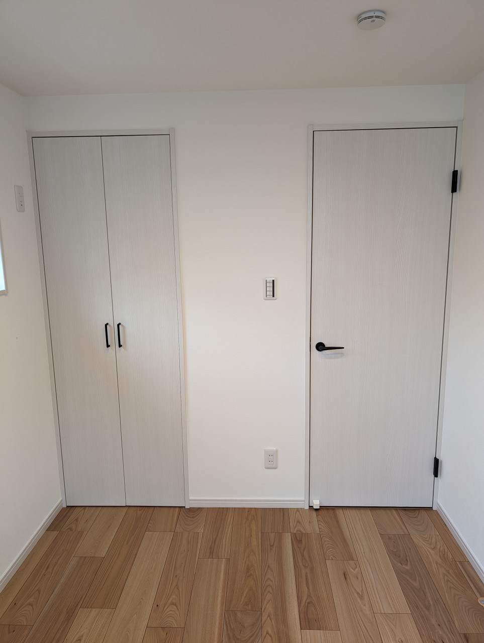 ホワイトアッシュの建具とエルムのフロア 取手や丁番はブラック色