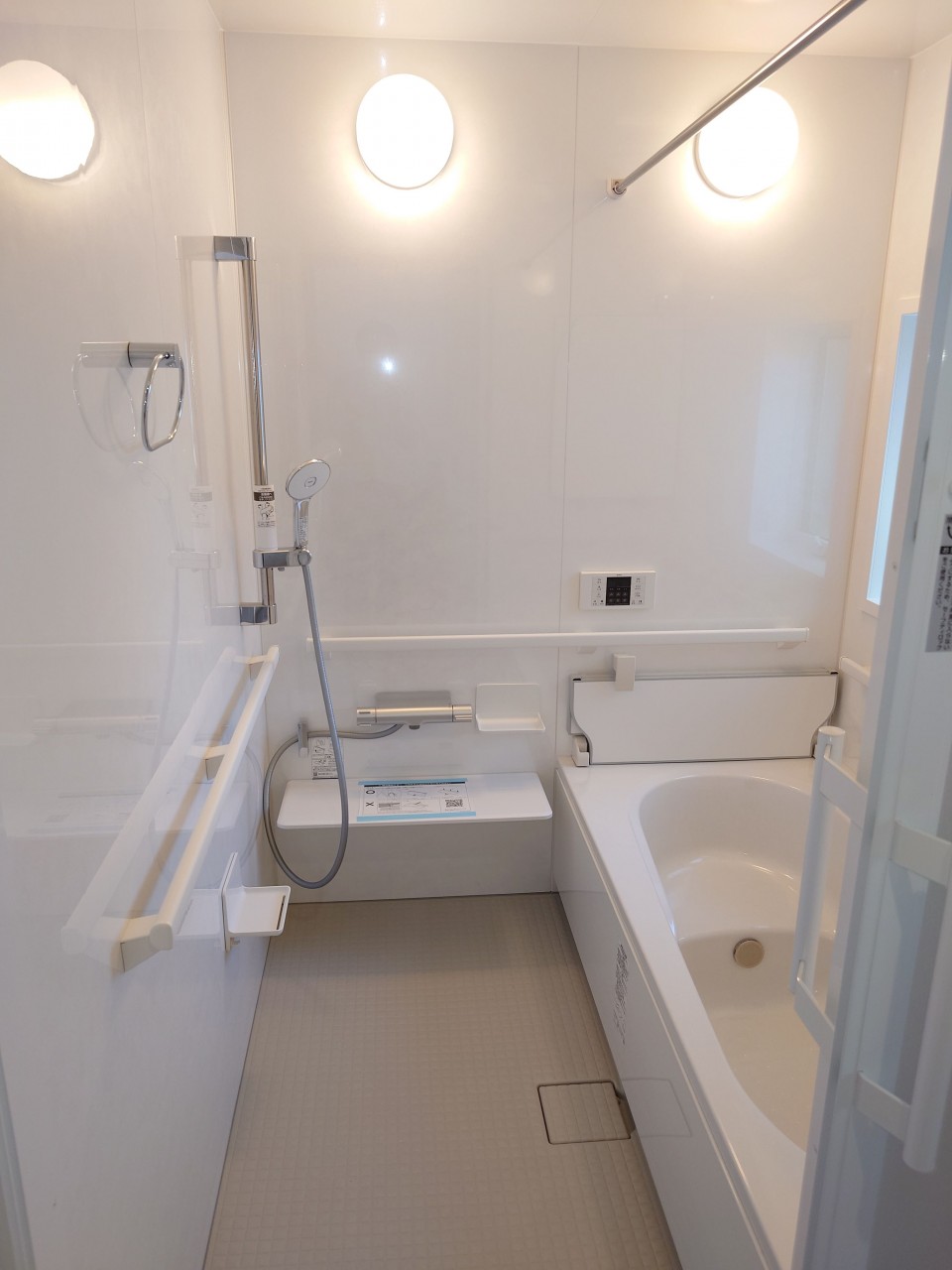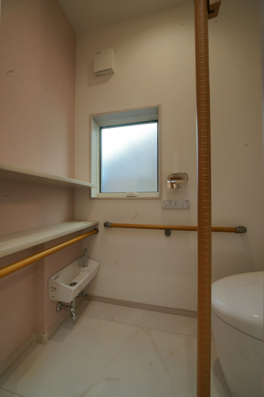 トイレには壁手摺りと天井と床で縦に突っ張る縦型手摺りも設置して安全サポート
