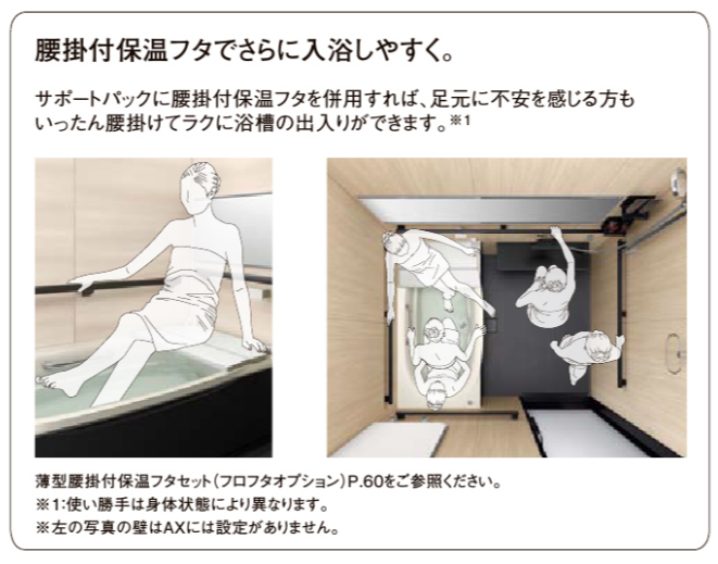 風呂フタを腰掛けタイプにすることでラクに出入りできます。