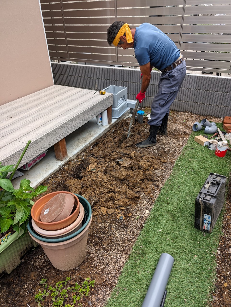植木やデッキ工事が完了したので最後に立水栓を設置しにきました。