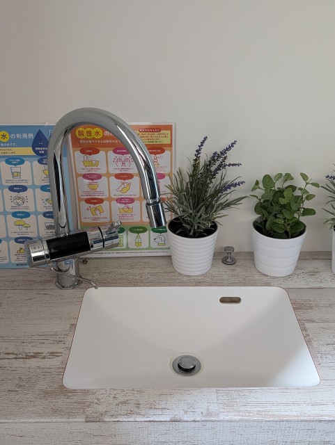 事務所棟の水素水の水栓を設置して実際にシンクとしてつかっているカウンターにも