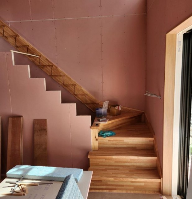 吹き抜けのLDKにオシャレ階段!クロスも貼り終えたあとにおしゃれ階段手摺も設置します!完成が楽しみです♪