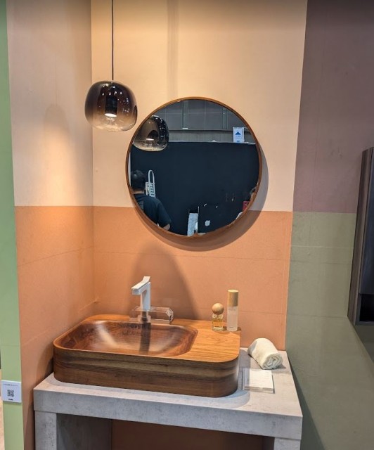 洗面台は他にも、木製のシンクもこだわりの雰囲気でしたね。塗装をしっかりしているので10年間雨ざらしにしても腐らないと教えてもらったので、水まわり中の水周り、シンクで使っても安心だなと思いました。