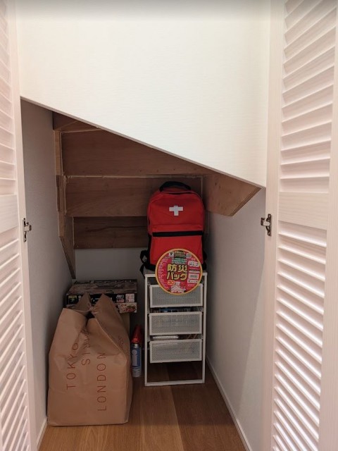 災害にそなえて水や防災グッズなどを備えています。