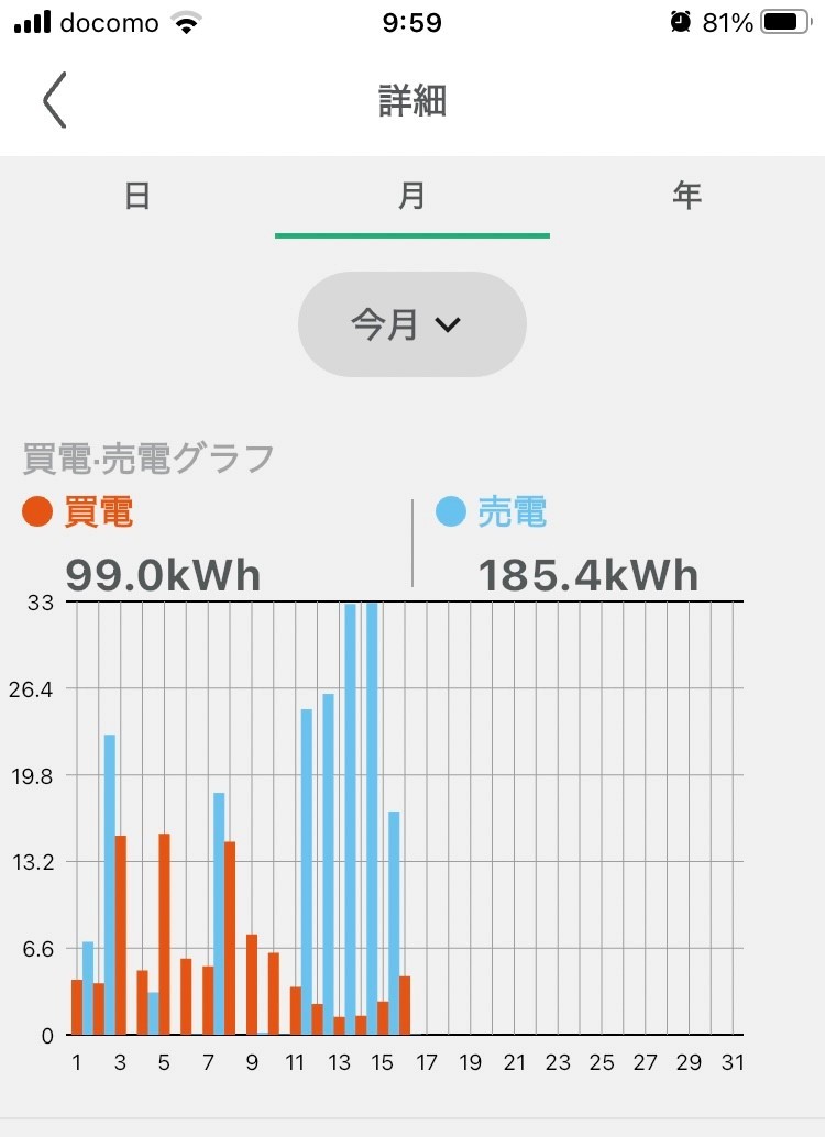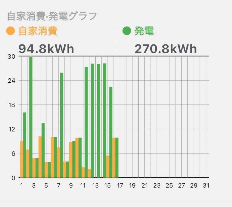 10kw載せていると、自家消費より発電の方が3倍多いですね。