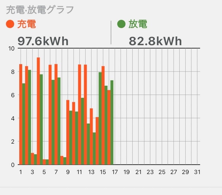 上、二つのグラフと見ても天気の悪い日が太陽光の発電とそれに伴う充電も下がることが分かりますね。