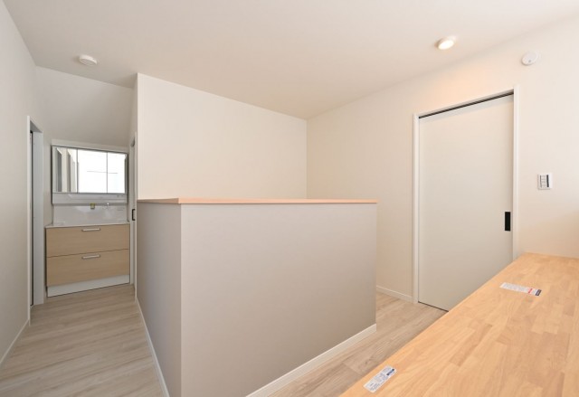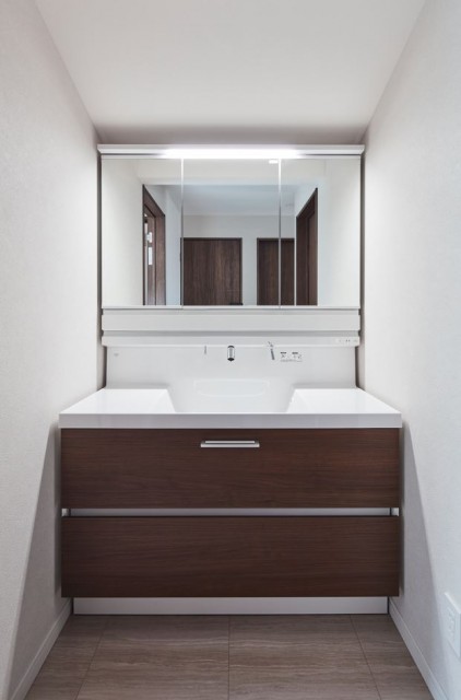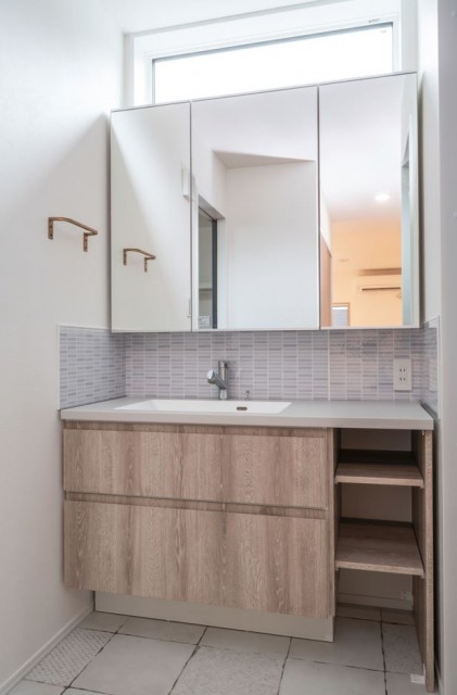 脱衣室というクローズの空間に置かず、廊下などオープンな共有スペースに置くことで、生活感の出やすい化粧台をよりきれいに見せなくちゃ、という側面はありますが、家族が主に使う2Fの見えにくいスペースで見せない工夫や、家族以外のお客さんに見える見えないにかかわらず、オシャレな雰囲気にするのも人気です。