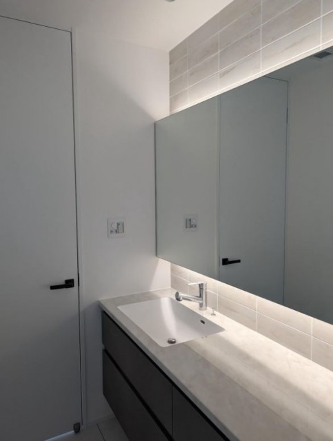 下の写真のお宅は常夜灯のような役割もかねて、廊下設置の洗面カウンターのミラーの上下に間接照明を仕込んでいます。間接照明の壁のタイルもオシャレ、こだわりの洗面スペースになっています。