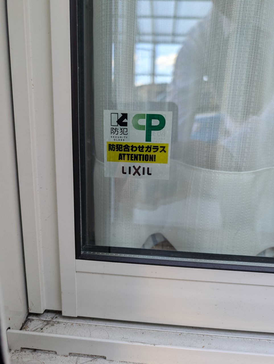一見普通のガラスに見えますがガラスの左下を見ると防犯ガラスのシールが貼られています。