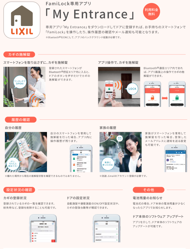 遠隔地から施解錠の履歴や通知を確認できるほか、いつだれが外出・帰宅したかを確認できる機能もついたファミロックは防犯対策にもなります。