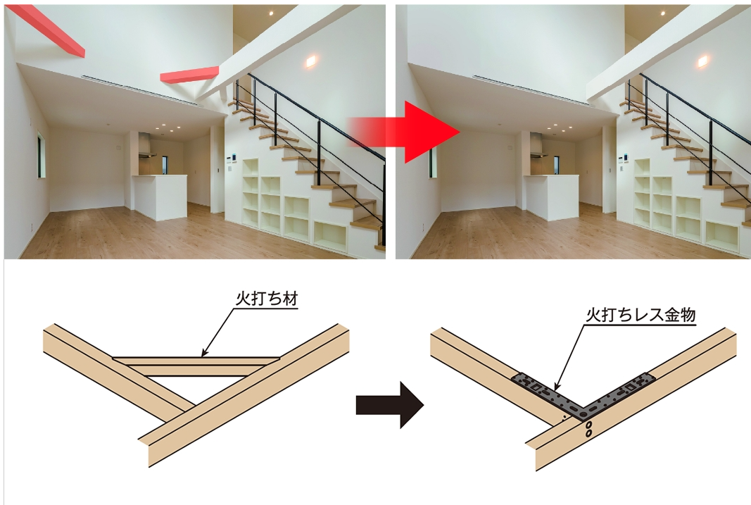 「火打ちレス金物」を使用すると火打ち材のかわりに補強してくれるので見た目スッキリの仕上がりになります。