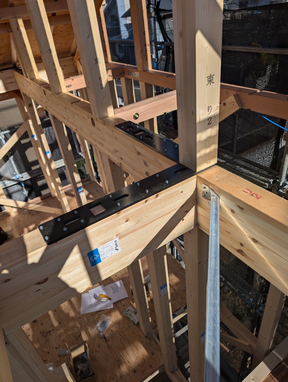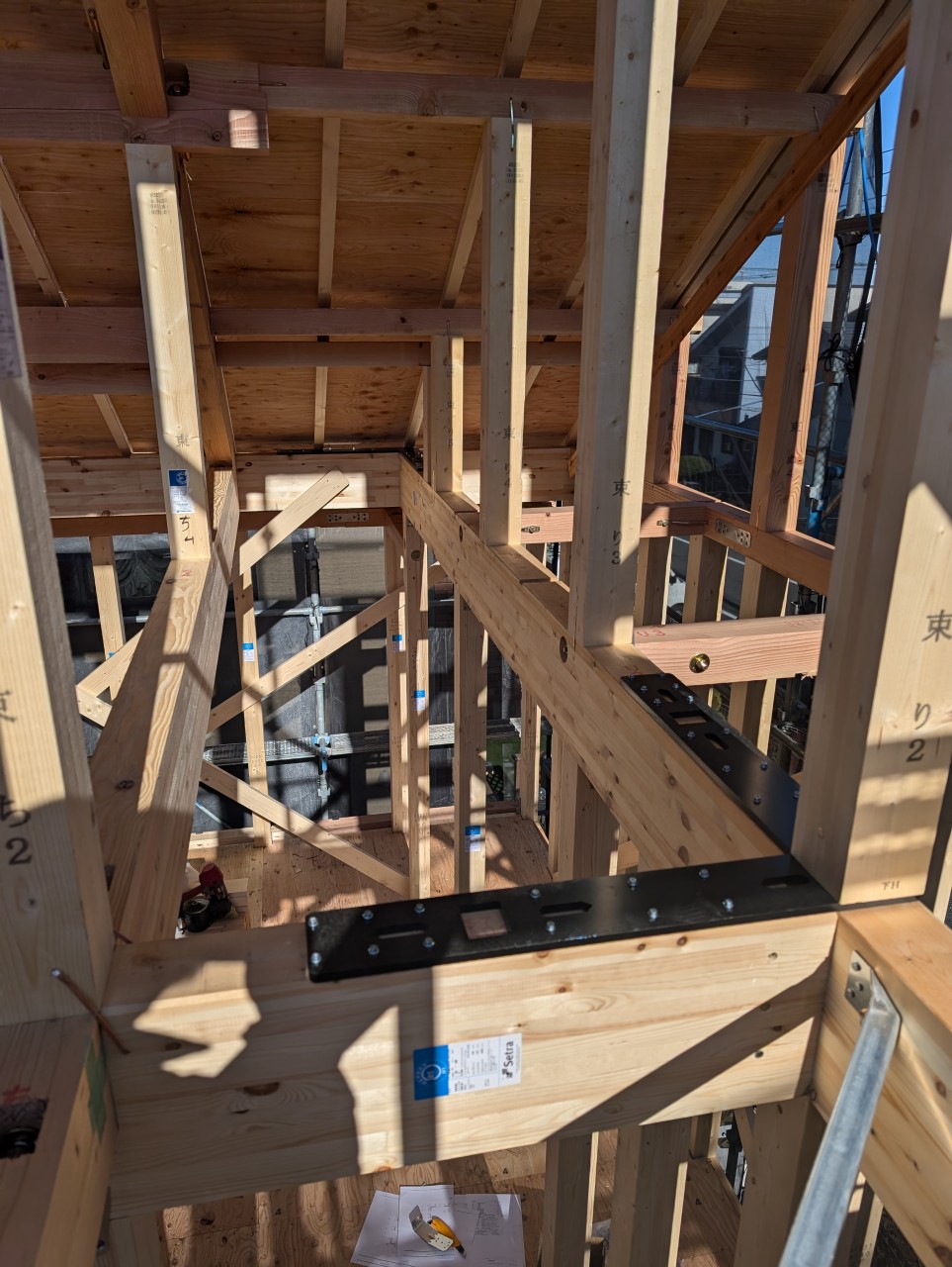 この現場は吹抜けをできるだけスッキリ見せるために「火打ちレス金物」を使いました。