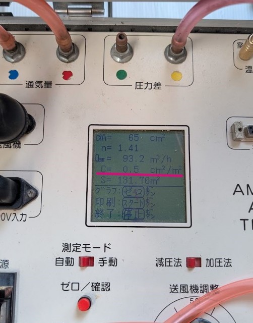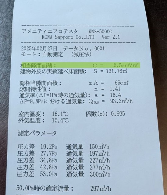 測定の結果は、隙間相当面積の値、C値で表され、数字が小さければ小さいほどスキマが小さく、C値=1以下は高気密と言えるかと思います。