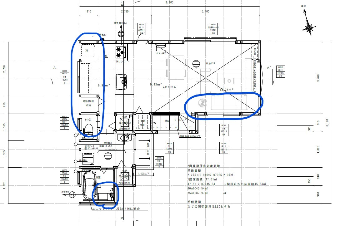 南側が少し特徴的な間取り(赤印)で2階が1階からはねだしている(青印)という事もあり、
