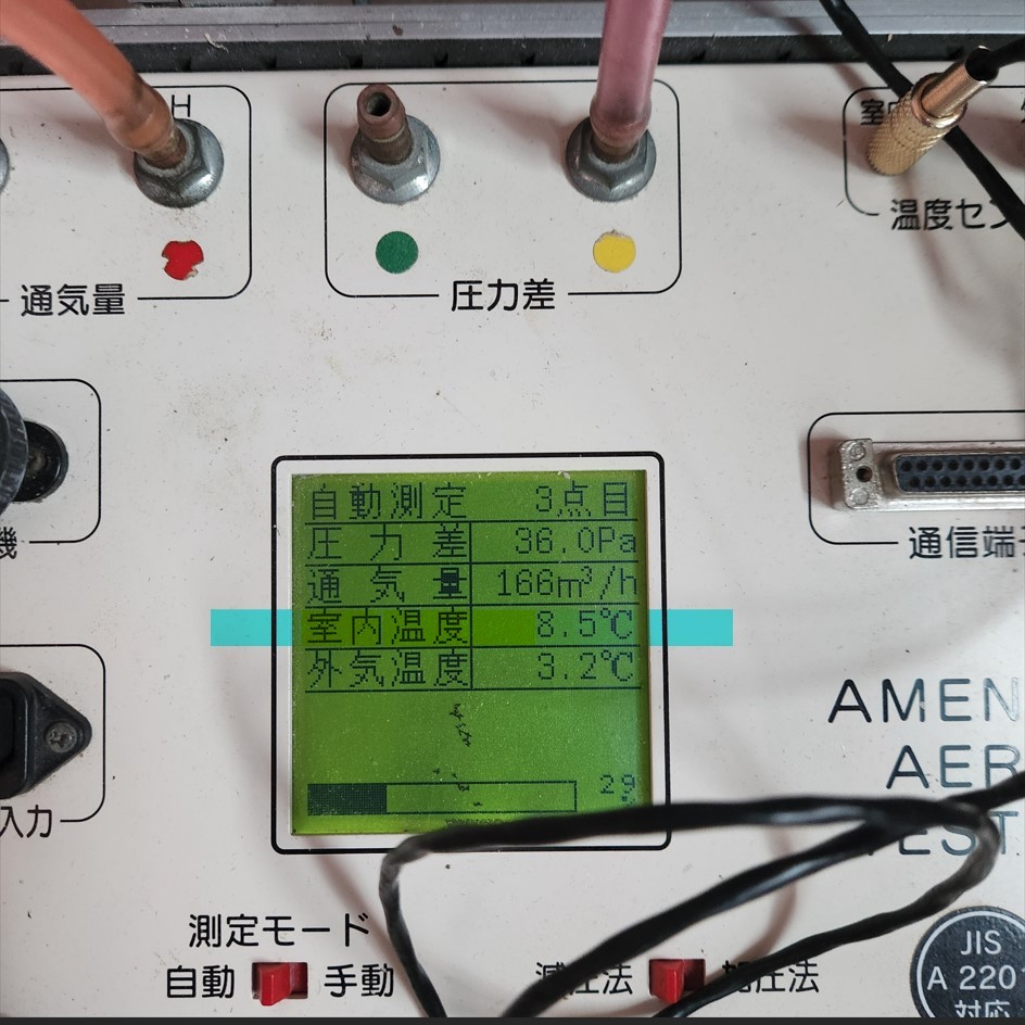 表題にある「町田市上小山田町6号棟新築分譲住宅」の「完成時の気密測定」を実施しました。
