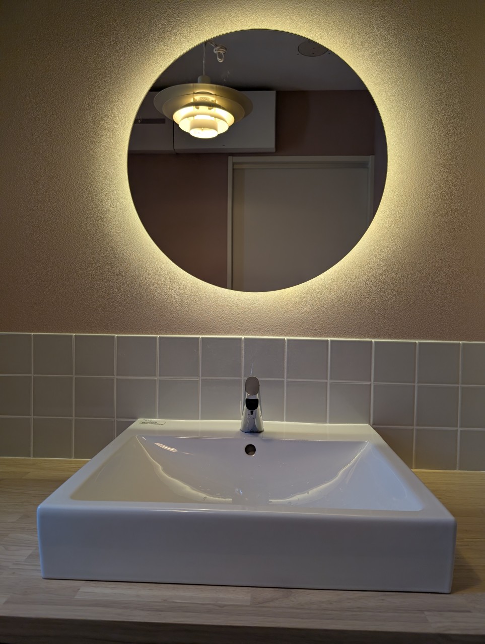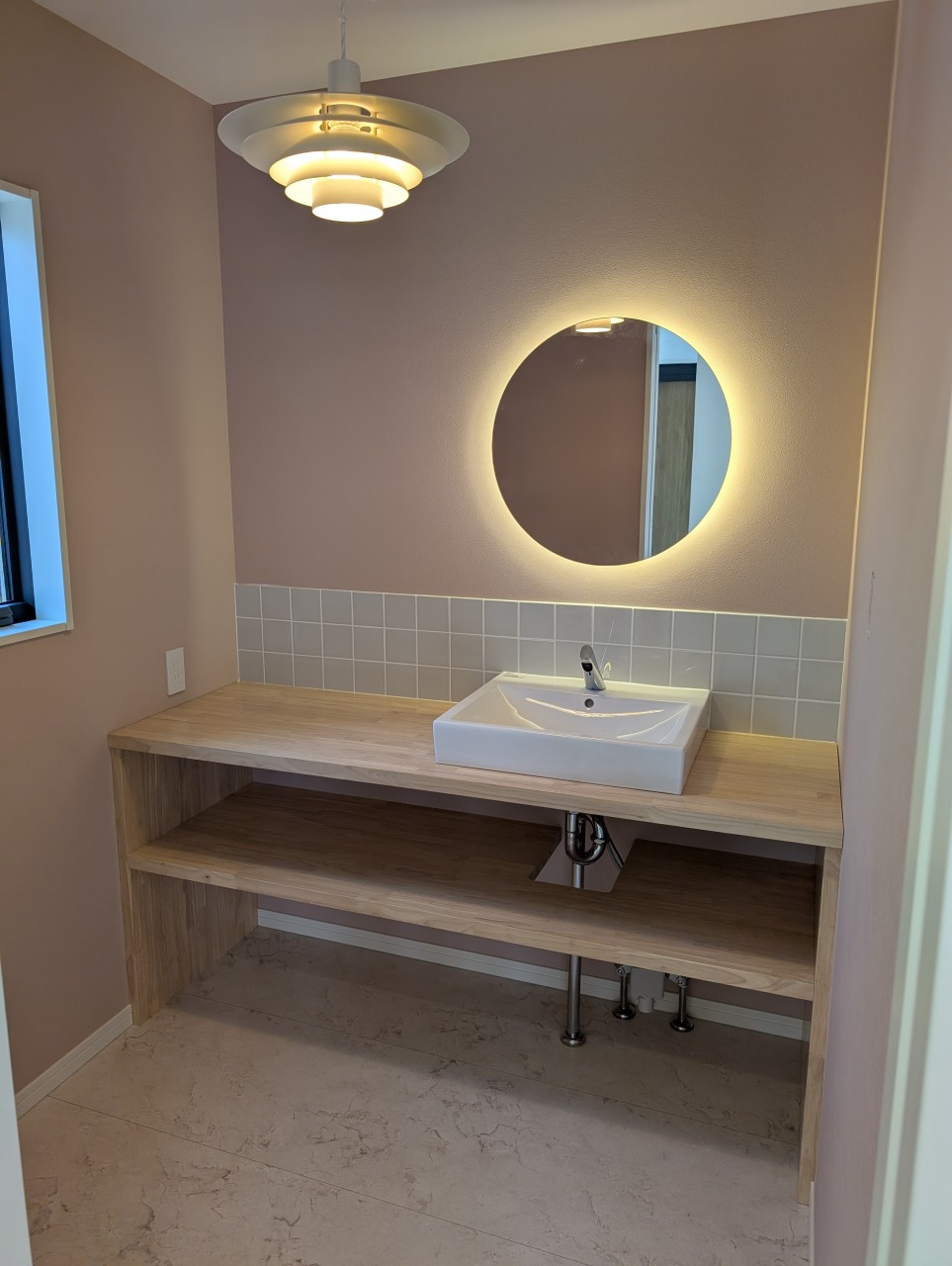 照明が内蔵された鏡を設置 水栓は混合の自動水栓