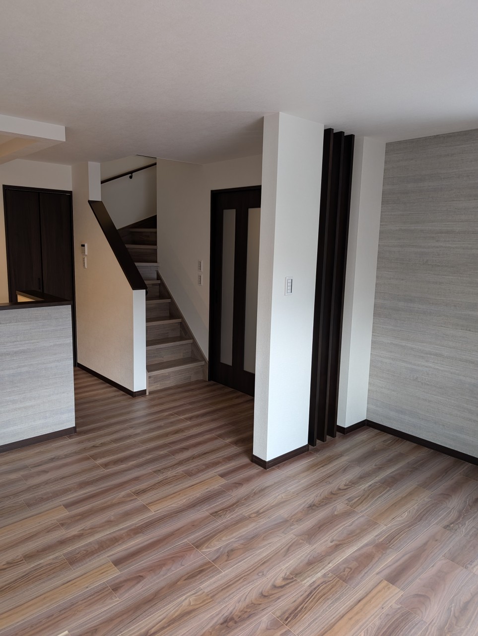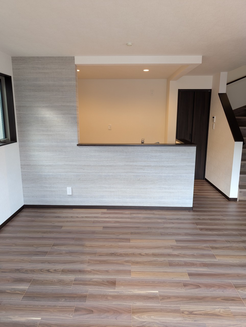 リビングとキッチンにグレーのアクセントクロスがおしゃれです