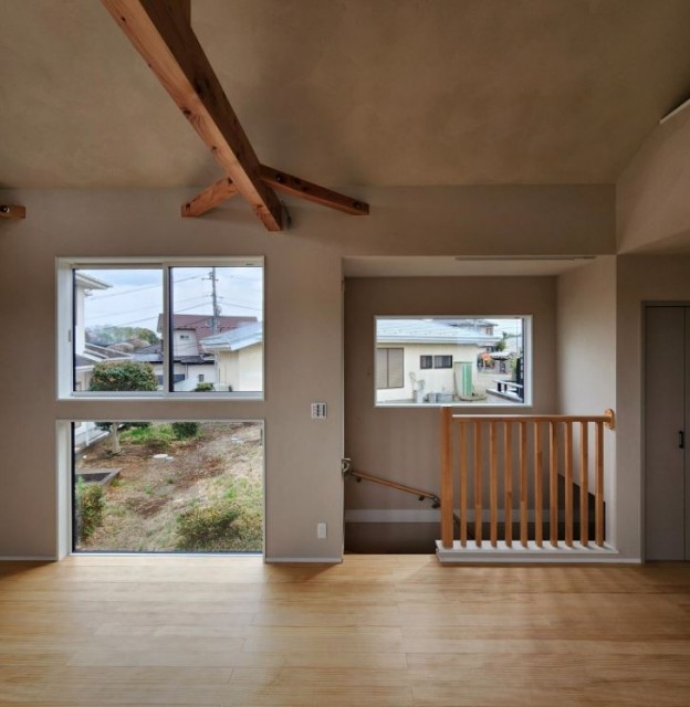 木製の化粧格子にする場合もあります。写真は上小山田町6号棟の階段吹抜けに面した手すりです。階段に面した階上の階段吹き抜けも階段とあわせてオープンな手すりにするのも木の感じが出て良いですよ。