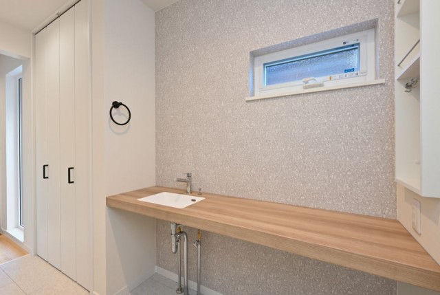 木目調のキッチンの背面、カップボード側や木目調の洗面カウンターの壁にアクセント使いでグレーを入れたり、