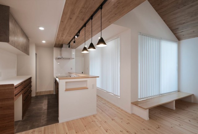 キッチンの吊戸棚の扉カラーとキッチンのフロアタイルをグレーで選んで廻りの床や天井、キッチン本体の木目と組みわせたお宅の事例もオシャレでした。