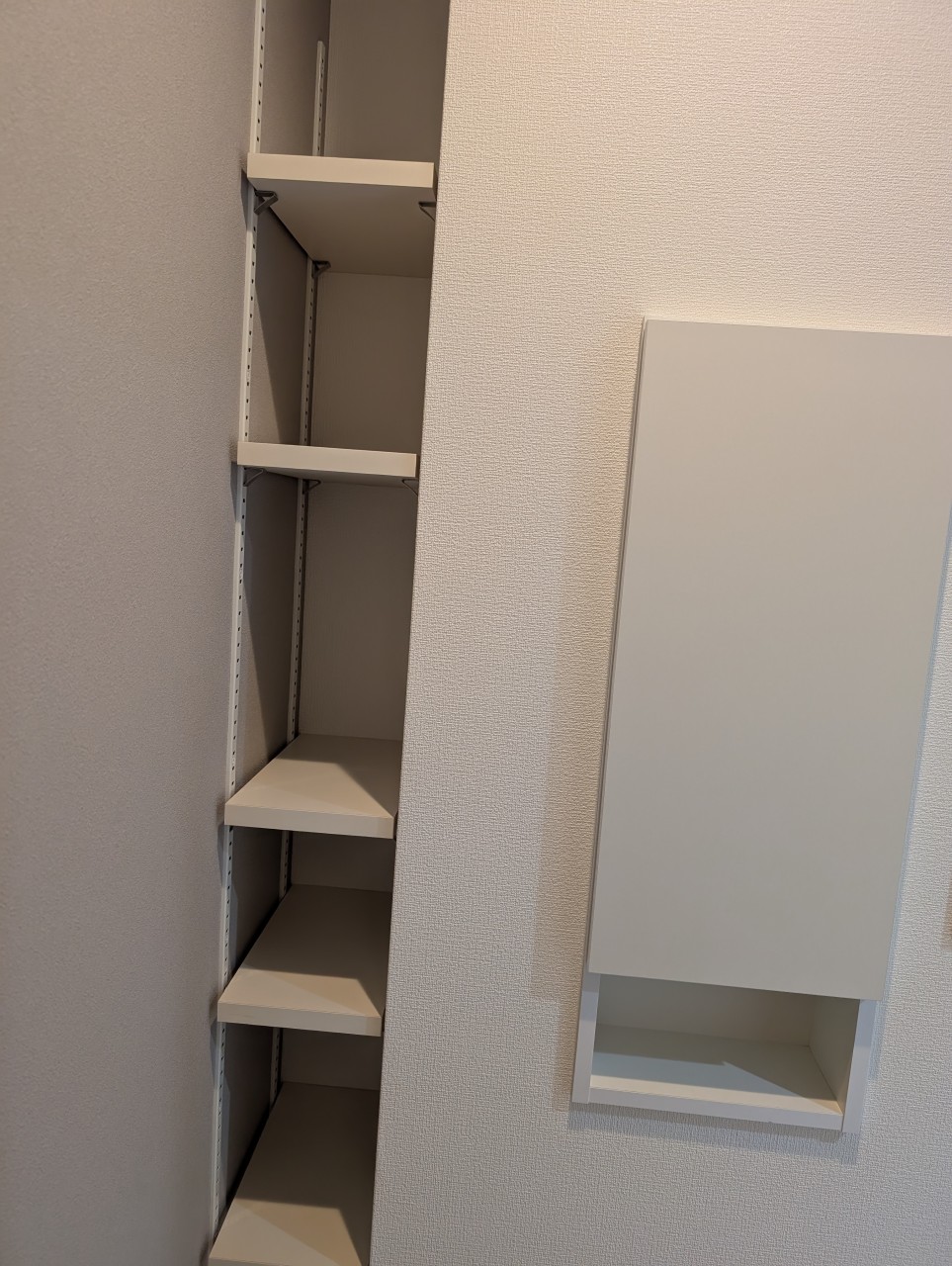 小さな可動棚を設置して収納力アップ、デッドスペースを有効活用してます