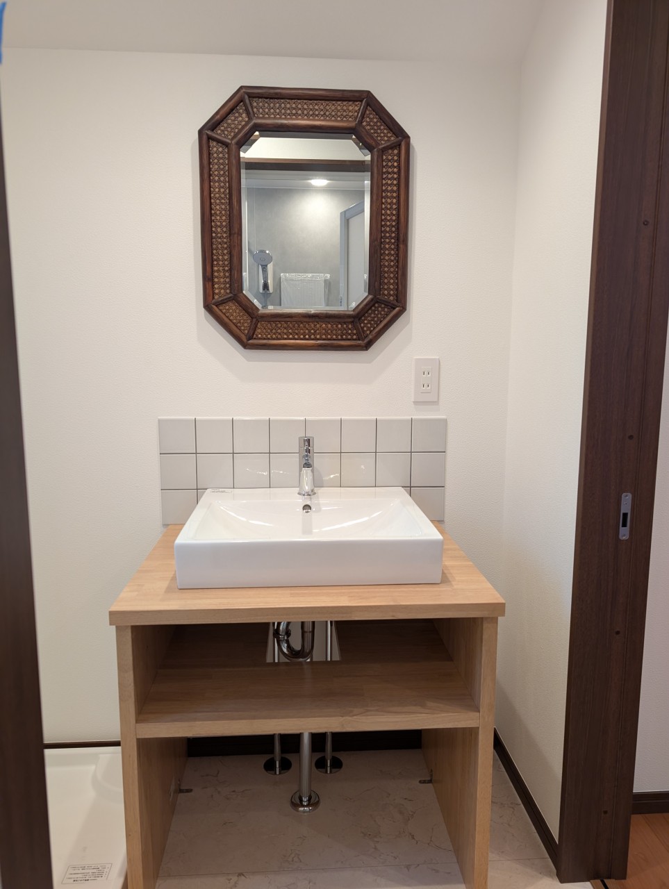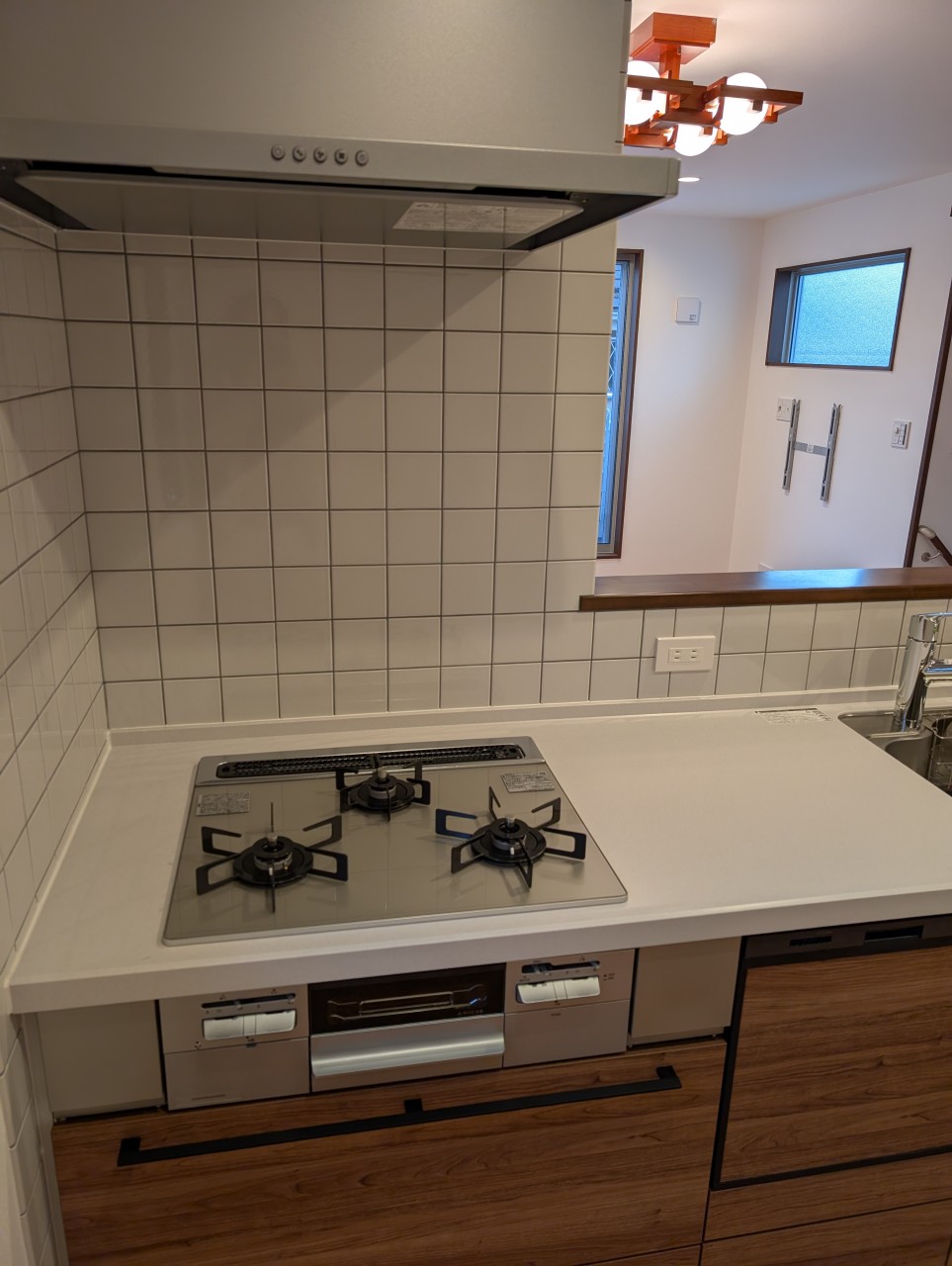 壁はリクシルのホワイトタイルにグレー色の目地にしました。