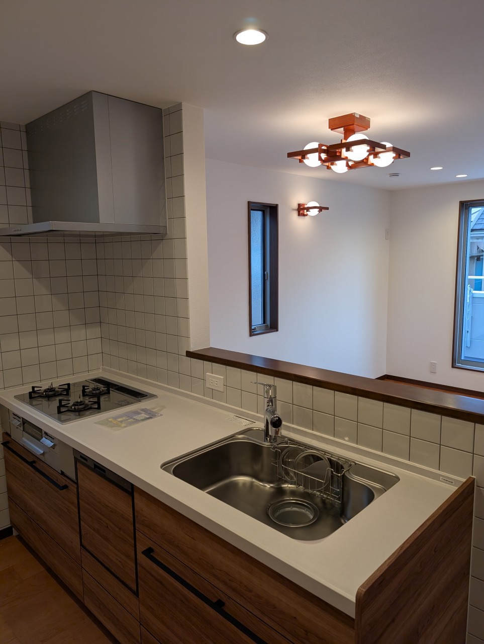 タイル張りがオシャレなキッチンと素敵な照明器具があるリビング・ダイニング