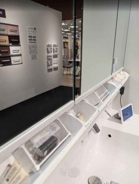 注文住宅で使うことの多い、洗面化粧台の便利な収納機能を実際に見て触って、