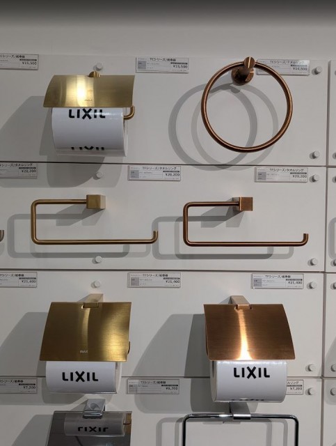 最近は、取っ手など金物でブラックの他に真鍮系やゴールド系が弊社のお客様にも人気だな、と思っていたら、リクシルさんのトイレアクセサリーにもバッチリラインナップされていて、いい感じでした。
