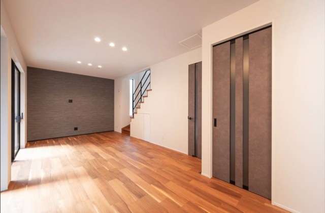 ミディアム系の床に対して建具色の方が少し濃い色の組み合わせ事例もあります。