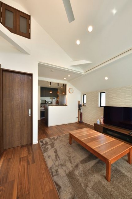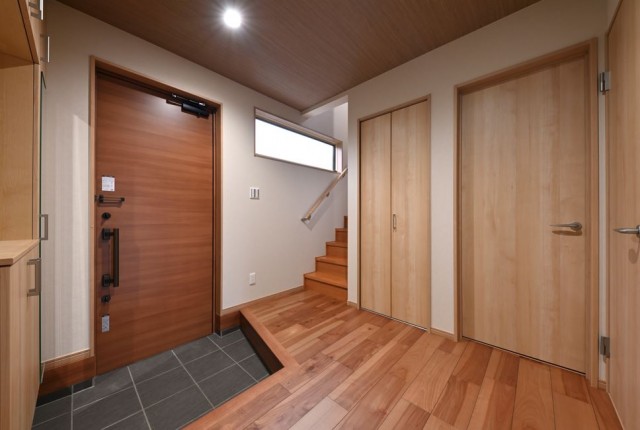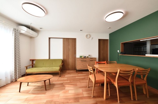 上の写真の事例もそうですが、ミディアム系の床の事例をいろいろ見ていると、アクセントで入れるカラーを際立てておしゃれに活かすのに、建具も同系色でえらばれることが多いのかなと思いました。