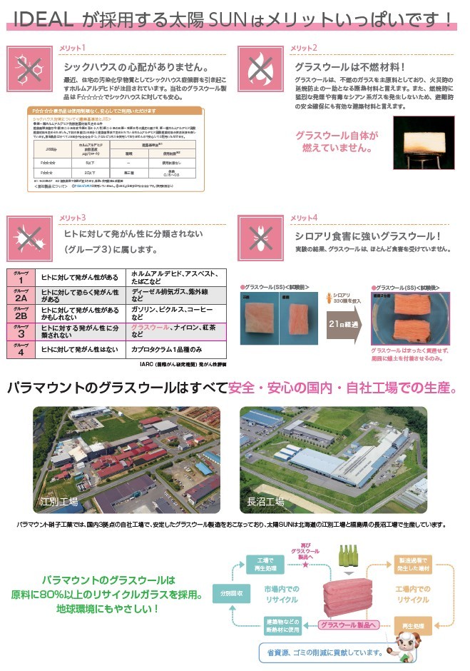 アイディールの注文住宅仕様で使う断熱材はグラスウールの袋なしタイプ、ピンク色が特徴的な断熱材を使っています。注文住宅仕様の構成で検討に検討を重ね、選りすぐった材料です。