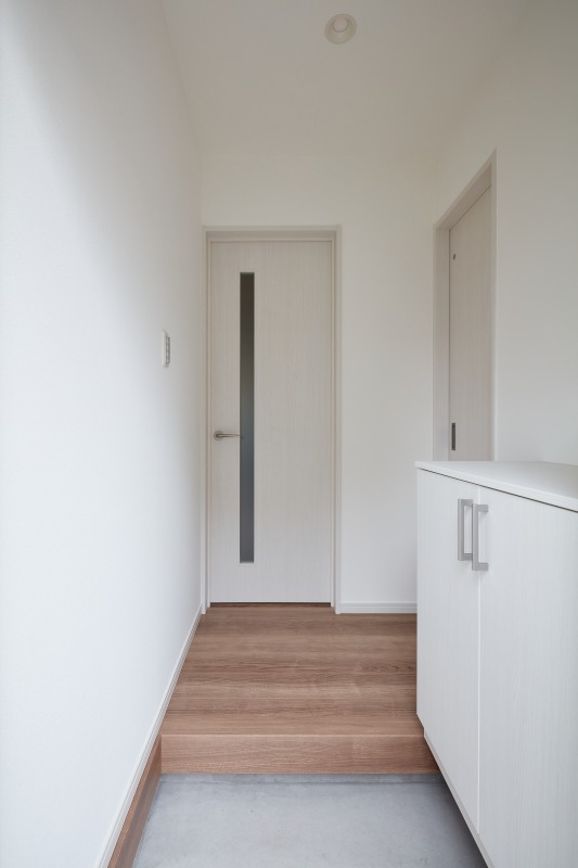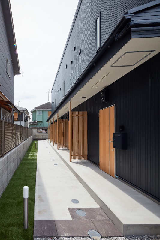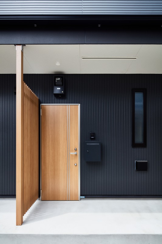 ブラックの外壁に隣の部屋とのパーテーションの格子と玄関ドアの木目調が和モダンの雰囲気をつくりだしています!