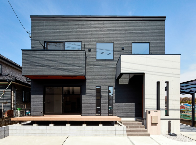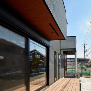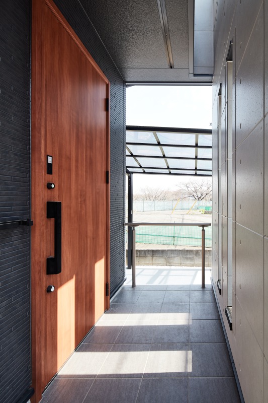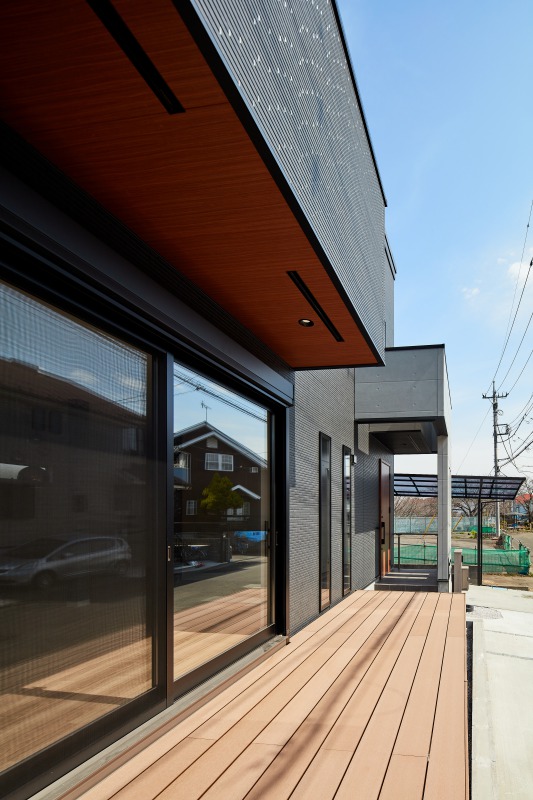 正面から少し見えるバルコニー下の軒天は玄関ドアと同系色の木目調であわせてオシャレに