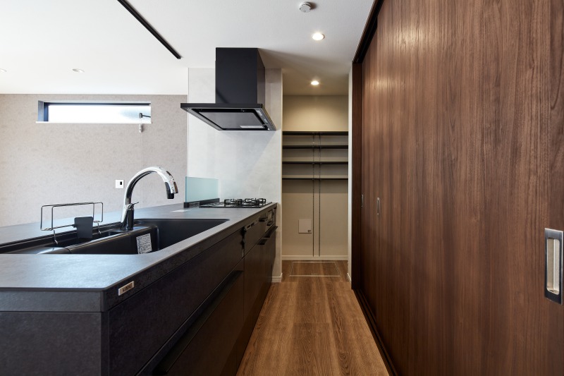 キッチンの背面の扉は食器棚&家電スーペース、キッチン奥にはパントリーで収納たっぷり