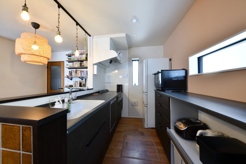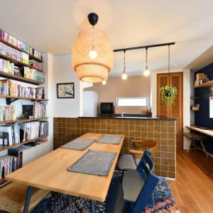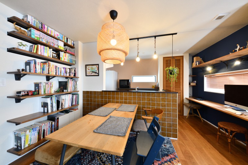 壁に造り付けたカウンター本棚 キッチンの背面壁には輸入タイル貼りで雰囲気も素敵なダイニングスペース