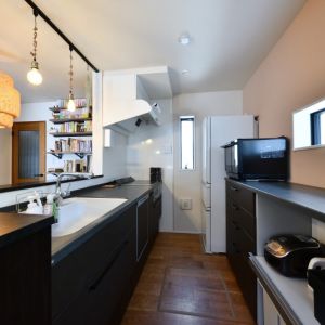 キッチンは上部に吊り戸をつけずにオープンに 手元灯の多灯づかいも◎ フックでプランターもかけられるダクトレールが便利