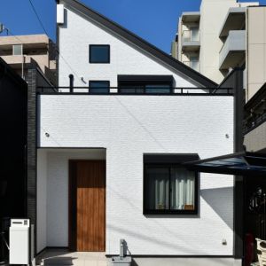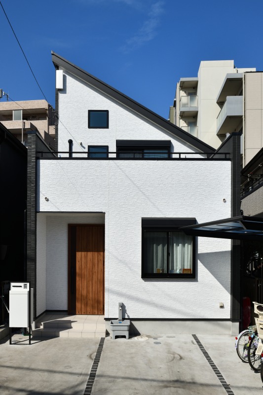 黒いサッシと木目調の玄関ドアが効いているかっこいい外観
