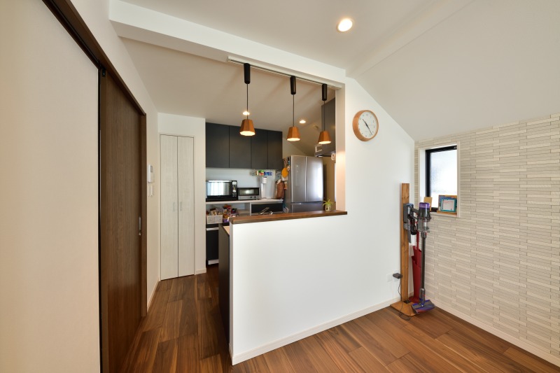 キッチンの手元灯を兼ねたペンダントライトがインテリアのアクセントに