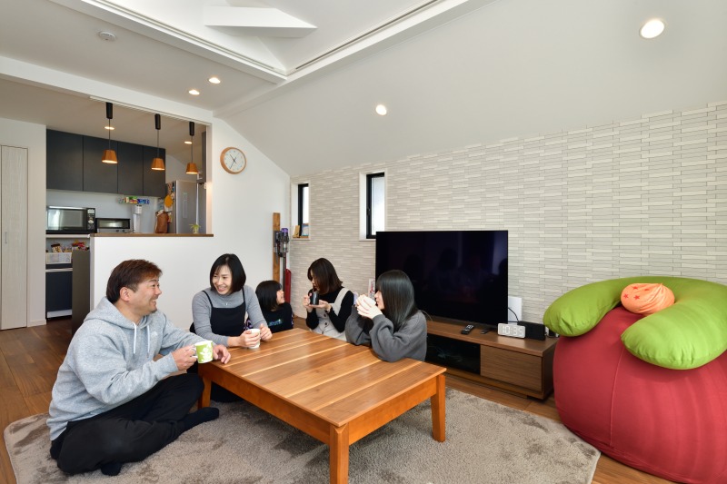 家族の会話が弾むLDK TVの後ろのエコカラットプラスがクロスとは違うアクセントで素敵
