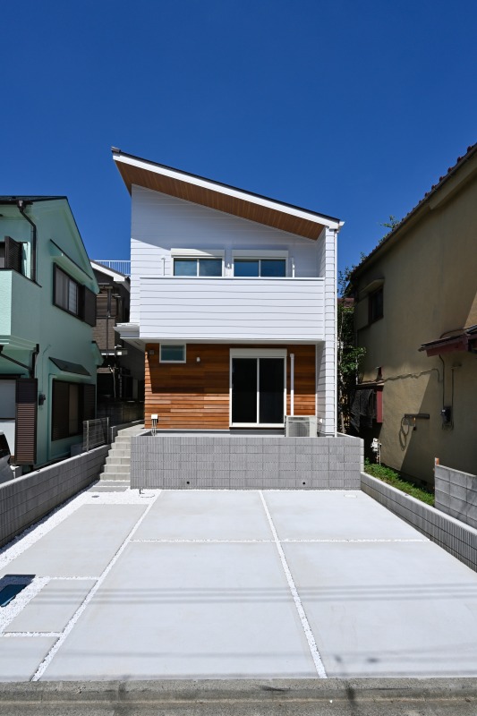 ホワイトのガルバリウムにリアルな木製の外装材の組み合わせがおしゃれな外観