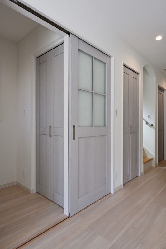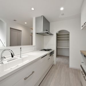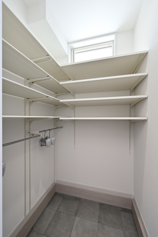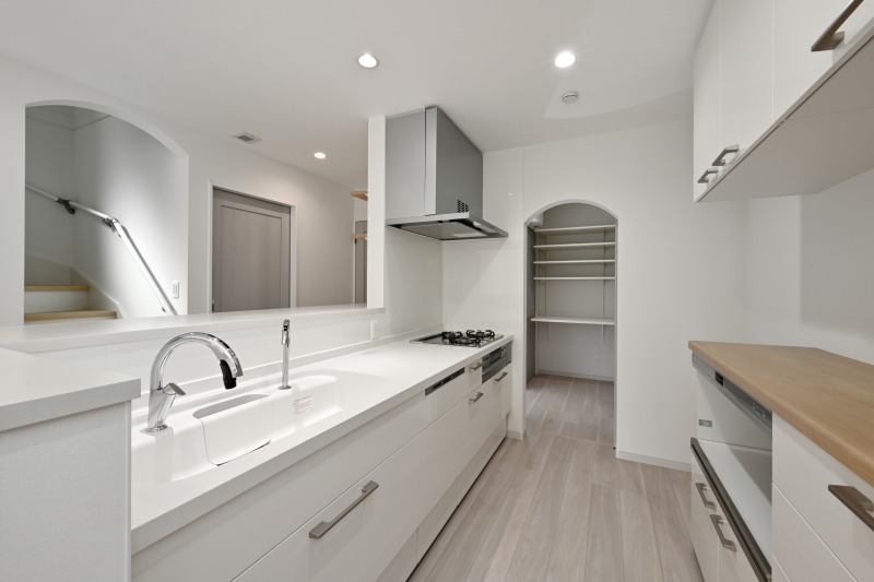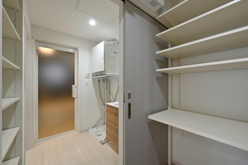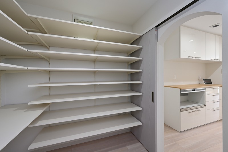 大容量のストックができるパントリーは扉付きで隠せる収納スペース