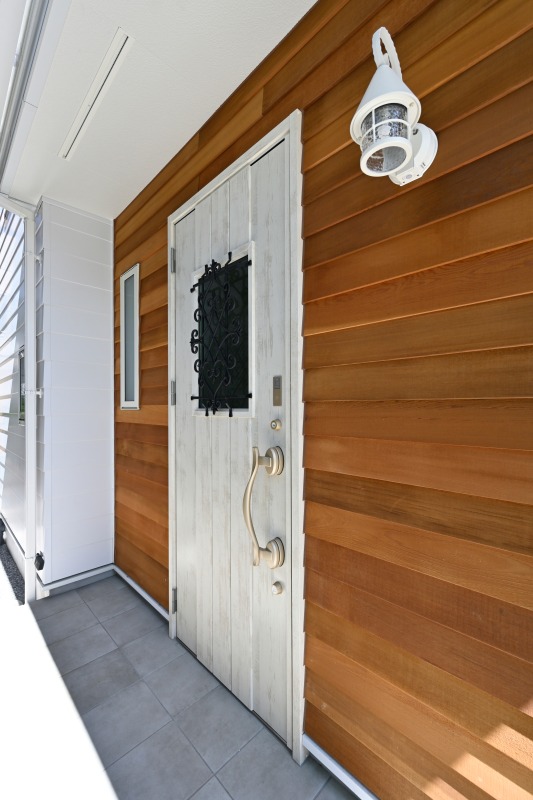 玄関ドアと外灯はホワイトで外壁やサッシとコーディネート