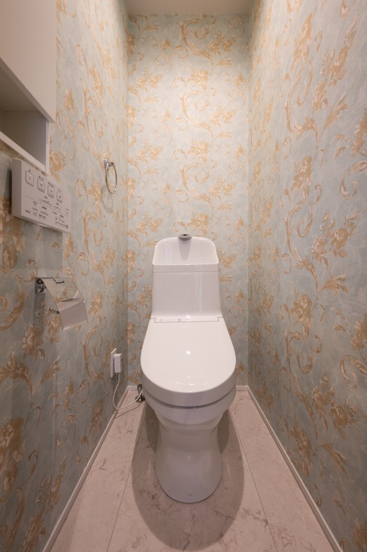 ブルーの壁紙で落ち着いた雰囲気にした寝室