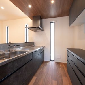 キッチンと同色で揃えた食器棚はたっぷり食器が入ります