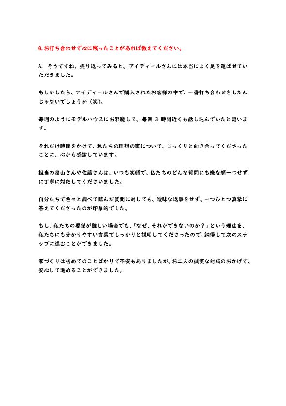 そんな中で、アイディールさんと初めてお会いした時から、他社とは違う「誠実さ」を強く感じました。私たちの要望や疑問に対して、メリットもデメリットも包み隠さず、本当に正直に話してくださったんです。家づくりに関する知識が豊富なことはもちろん、私たちのライフスタイルや価値観を丁寧にヒアリングし、寄り添う姿勢がとても印象的でした。