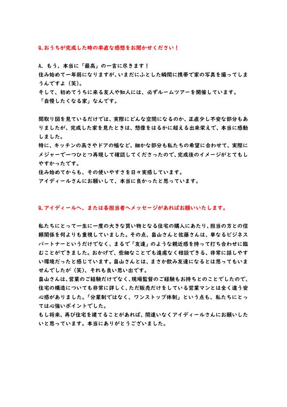 Q.暑い時期からのお引っ越し、そして一冬越してみての新築の住み心地はいかがでしょうか?